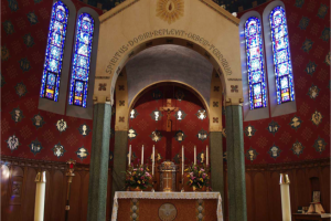 The walls of my parish Church answer the question. The clerestory walls are painted Spanish red, and upon this great canvas are also painted the stories of the lives of twenty saints, surrounding us like a great cloud of witnesses (cf Heb 12:1). (See also the video below.) And over the head of every saint is a tongue of fire.